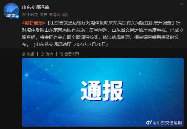 據(jù)山東省交通運(yùn)輸廳官方微博消息,山東省交通運(yùn)輸廳20日發(fā)布最新通報稱,針對媒體反映山東萊榮高鐵有關(guān)施工質(zhì)量問題,山東省交通運(yùn)輸廳高度重視,已成立調(diào)查組,將會同有關(guān)方面全面調(diào)查核實,依法依規(guī)處理。相關(guān)調(diào)查結(jié)果將及時公布。