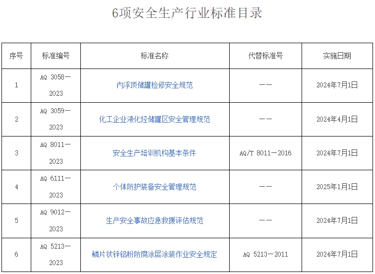 其中,《化工企業(yè)液化烴儲(chǔ)罐區(qū)安全管理規(guī)范》將于今年4月1日起正式實(shí)施,《個(gè)體防護(hù)裝備安全管理規(guī)范》標(biāo)準(zhǔn)將于25年1月1日起實(shí)施,其余4項(xiàng)安全生產(chǎn)行業(yè)標(biāo)準(zhǔn)均將于2024年7月1日。