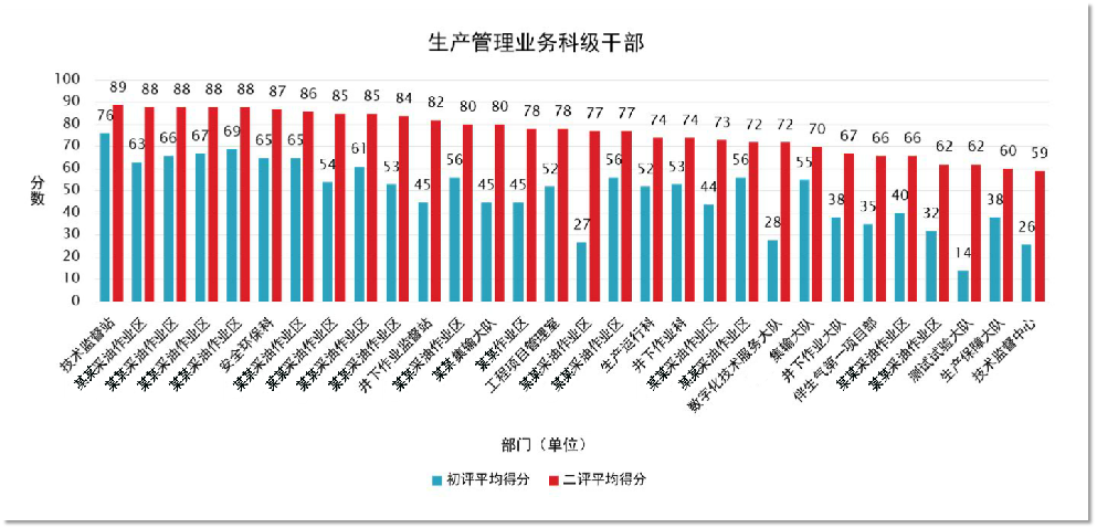 | 以“生產(chǎn)管理業(yè)務(wù)科技干部”為例,同一部門“兩次”測評結(jié)果分布圖,每個“點”代表該部門的一個員工(見下圖)。 | |||||||