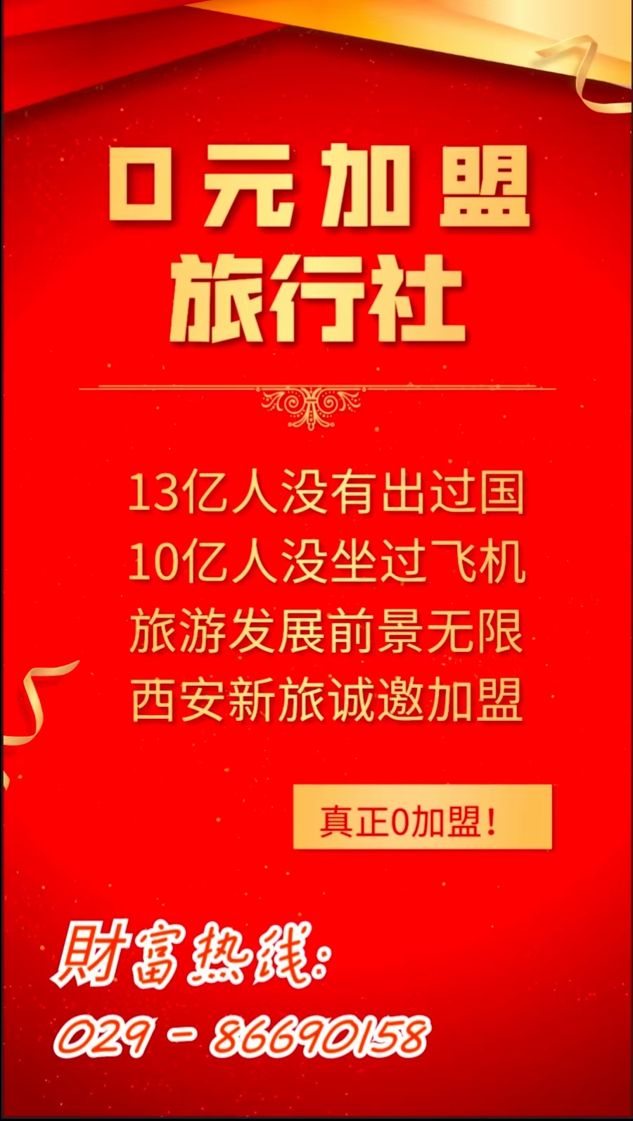 旅行社簡介: 西安新旅國際社地處西安鐘樓商圈,是一家綜合性旅游企業(yè)。先后組織接待了眾多大型旅游團(tuán)隊(duì),得到國內(nèi)外游客和同行的好評!近年來企業(yè)規(guī)模不斷壯大,分公司遍布四川、甘肅、新疆、陜西、內(nèi)蒙、青海、貴州等省。主營濱海度假、草原休閑、山岳探險(xiǎn)、鄉(xiāng)村民俗、紅色旅游線路等。其中紅色旅游線路涵蓋省內(nèi)所有紅色景點(diǎn)及省外主要紅色景區(qū),接待并服務(wù)過近百家企事業(yè)單位。我社將繼續(xù)開發(fā)設(shè)計(jì)高質(zhì)量旅游產(chǎn)品并提供全方位、多元化、高層次的服務(wù)。