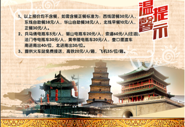 12、請大家增強時間觀念,在規(guī)定的地點按時集中。西安旅游車程相對輕松,西安至延安約5小時,西安至臨潼約1.5小時(在游覽過程中請嚴(yán)格按照導(dǎo)游規(guī)定的時間地點結(jié)合上車,誤時不等);
