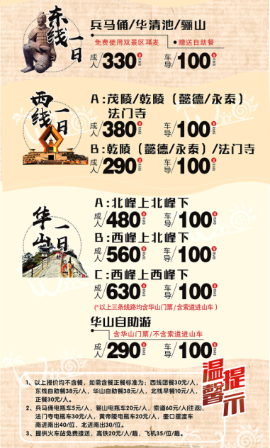 我們堅(jiān)持遵循:以質(zhì)量求生存、以創(chuàng)新求發(fā)展、以市場為導(dǎo)向、以服務(wù)為宗旨的經(jīng)營理念,為游客提供全方位、多元化、高層次的服務(wù)。 感謝各位對(duì)西安新旅國際旅行社的支持!